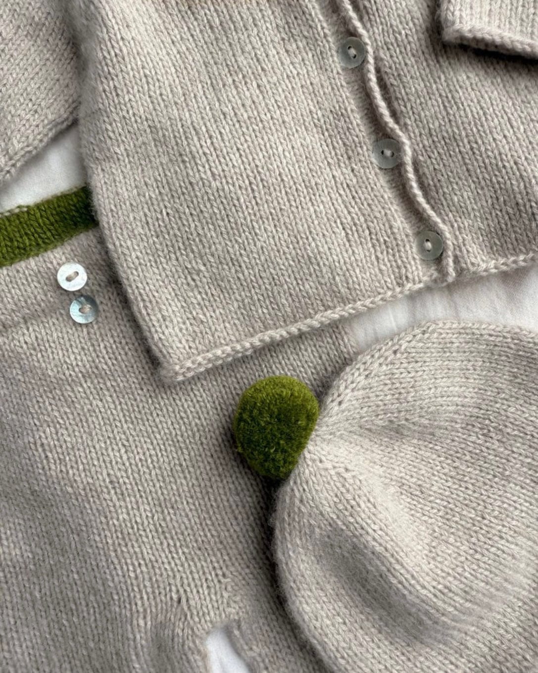 The Cleo Baby Set consists of a hat, a cardigan, and a pair of pants.