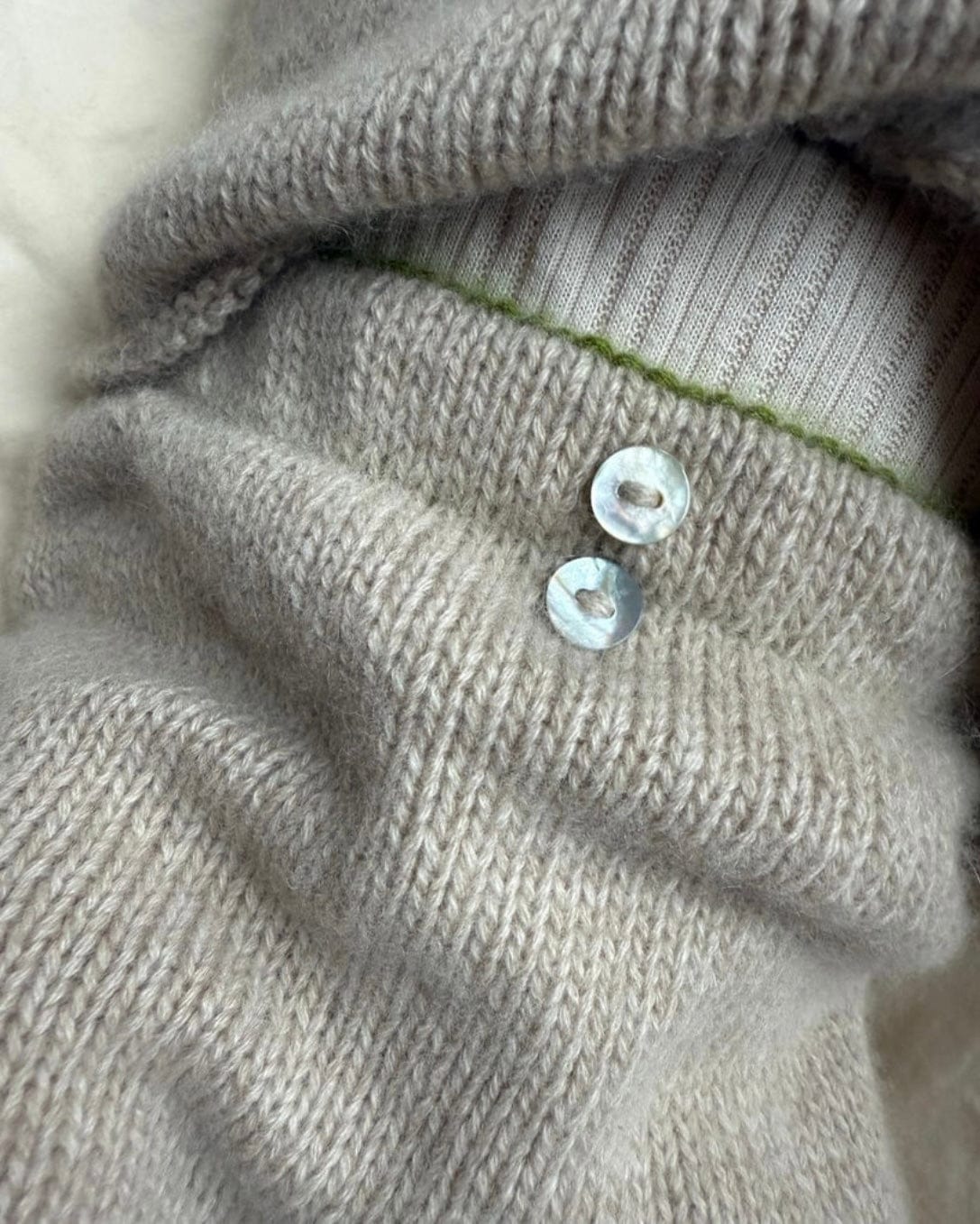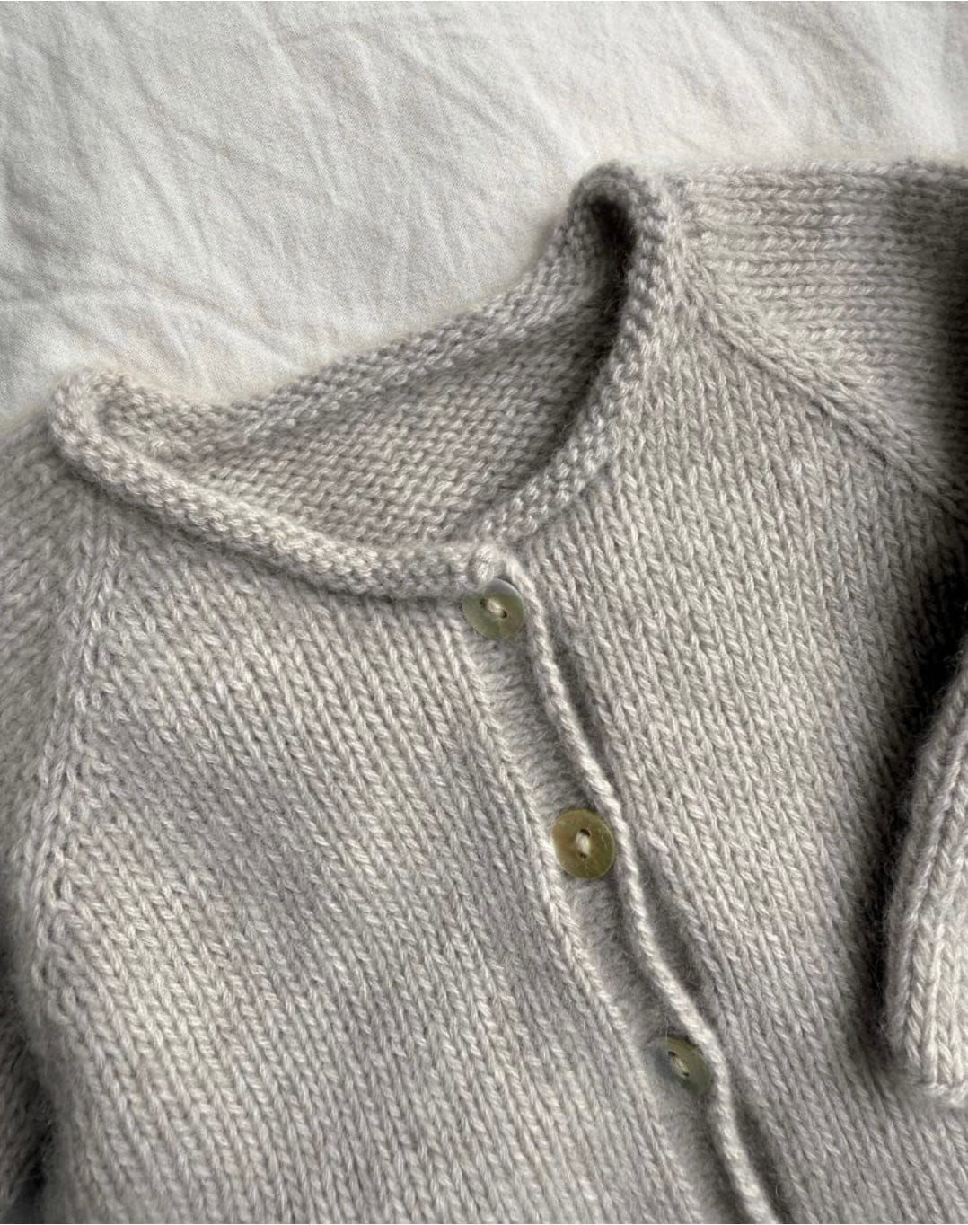 The cardigan is worked from the top down with raglan increases. The cardigan has rolling edges in stockinette stitch. The stockinette stitch front plackets are worked at the end as well as a stockinette stitch neck edge.