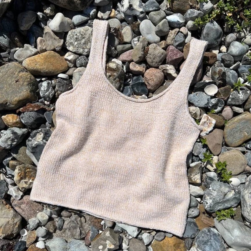The June Top is worked from the bottom up. The body is worked in the round in stockinette stitch, then the work is divided into front and back, and each section is finished separately by working back and forth in stockinette stitch. The pattern also contains instructions for working the top from the middle by using a provisional cast on, so the length of the top can be adjusted at the end. The June Top is designed to have a deeper neckline on the back – but only so deep that it still covers the bra. A small i-cord edge is worked along all edges.