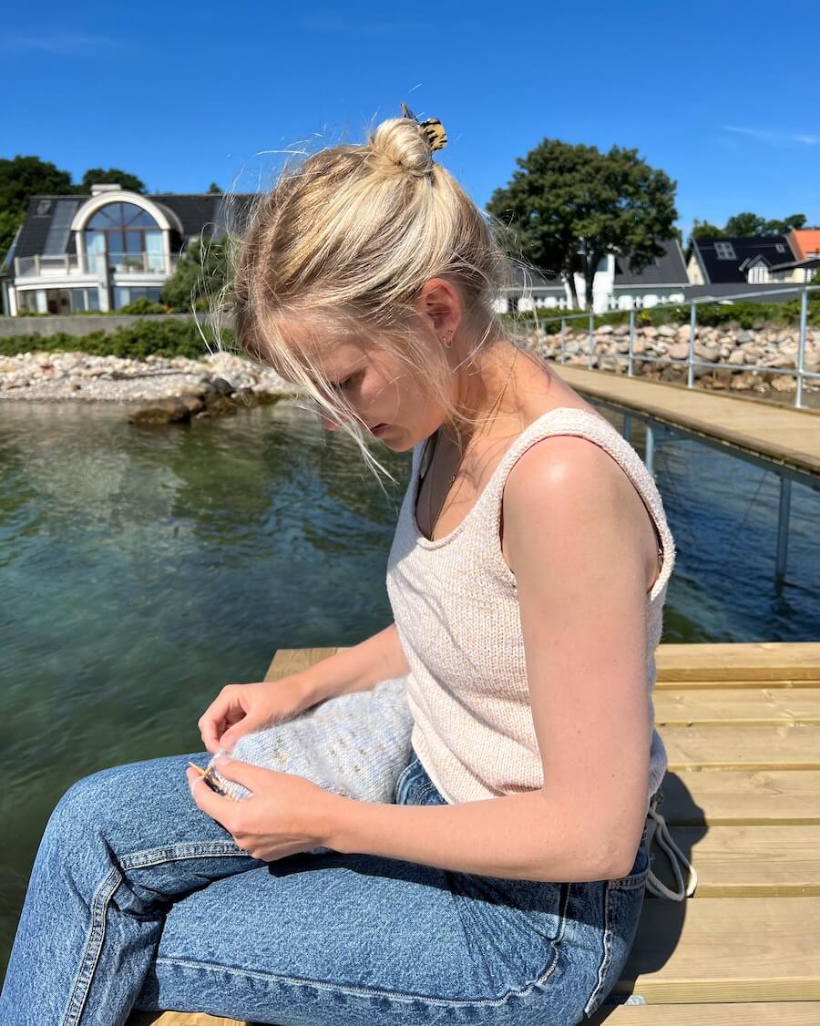The sizes XS (S) M (L) XL (2XL) 3XL are designed to fit a bust circumference of approx. 80-85 (85-90) 90-95 (95-100) 100-110 (110-120) 120-130 cm [31½-33½ (33½-35½) 35½-37½ (37½-39½) 39½-43¼ (43¼-47¼) 47¼-51¼ inches], which means that the June Top is designed to have approx. 5 cm [2 inches] of negative ease. Before beginning your project, measure yourself to determine which size to knit. For example, if you measure 89 cm [35 inches] around your bust (or around the widest part of your upper body) you should knit a size S. A size S top has a bust circumference of 84 cm [33 inches] which in the given example would give you 5 cm [2 inches] of negative ease.