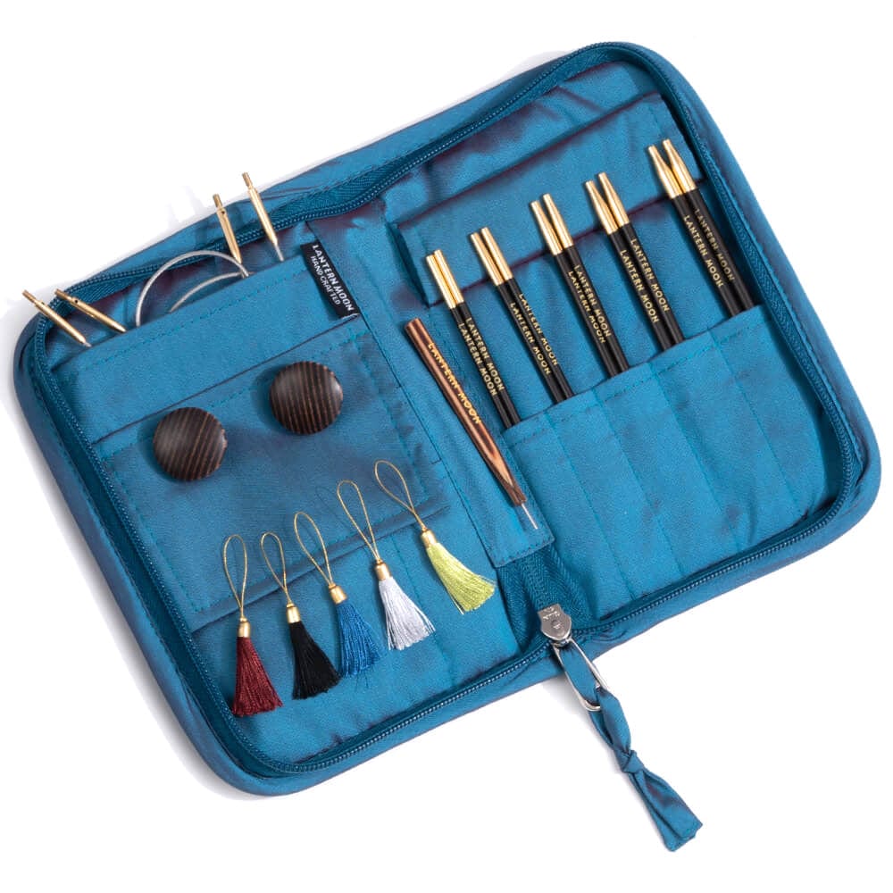 - A set of ebony wood interchangeable knitting pins and accessories supplied in a beautiful embroidered Khadi soft silk zippered case to keep everything safely stored and organised.