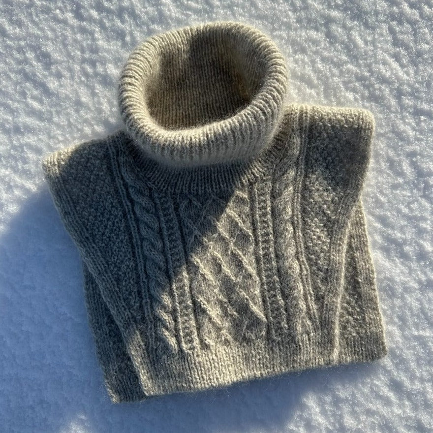 Moby Neck is worked in texture and cable patterns up the back, up and over the shoulders, and down across the front. An opening for the head is worked, where stitches are picked up and knitted along for the turtleneck collar. Moby Neck is shaped like a square at the back and like a trapezoid at the front.