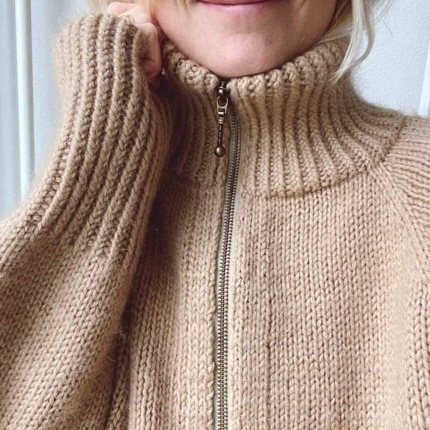 Materials: Suggestion 1: 500 (500) 550 (550) 600 (650) 700 (700) 750 g Peruvian Highland Wool by Filcolana (50 g = 100 m [109 yds]) (pictured in the colour Chai) or 600 (600) 650 (650) 700 (750) 800 (800) 850 Peer Gynt by Sandnes Garn (50 g = 91 m [98 yds]) held together with 125 (125) 125 (125-150) 150 (150) 175 (175) 175 g Tilia by Filcolana (25 g = 210 m [232 yds]) or Tynn Silk Mohair by Sandnes Garn (25 g = 212 m [232 yds]) or Brushed Lace by Mohair By Canard (25 g = 212 m [232 yds]). 6 mm zipper, 35 cm [13¾ inches].